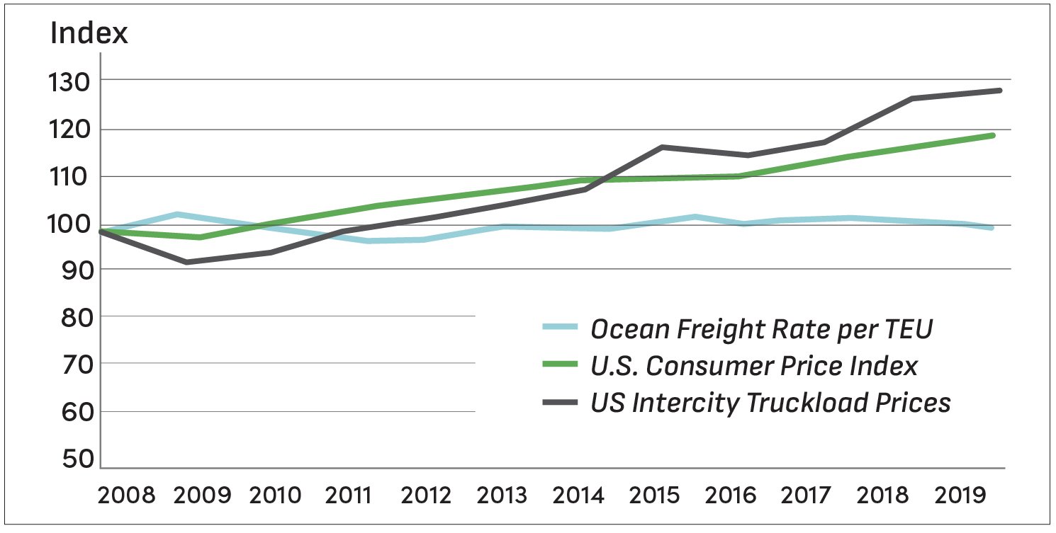 Historical Trend in CONUS/Hawaiʻi Ocean Freight Rates versus U.S. Consumer Price Index and Intercity Truckload Prices